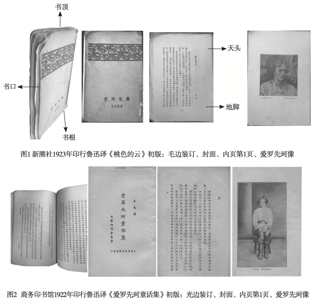要达到最佳效果,“新潮社文艺丛书”毛边本依靠的不仅是装帧与版式设计,同样还需要令设计得以实现的物质与技术基础。可以说,“新潮社文艺丛书”利用了其时最精良的机械印刷条件。在纸墨方面,周氏兄弟留日时便已注意到欧式及日式毛边本的封面多用皮革烫金或布面软精装,内页墨匀纸洁,编印《域外小说集》时,就曾尽力模拟其质感,用仿呢布质地的厚罗纱纸做书面,用“上好洋纸”印本文,自谓“印的特别考究”6。“新潮社文艺丛书”沿袭此制,封面用仿布质的重磅木造纸或布纹纸,插图用铜版纸,内文不再采用国内通行的质地脆弱、易氧化发黄的低价白报纸,而全部使用洁白光滑、不易变色、印字均匀的较高价道林纸。在印刷方面,“丛书”拼贴式地采用了其时最新颖的印刷技术。在同北京各印厂充分商讨价格、理解技术后,李小峰等几个新潮社员选定了京华印书局。作为商务印书馆在北京设立的印刷所,1921年京华印书局大增设备后,跃升为北京30多处印厂中规模最大,技术最新,制版最精也是价格最昂贵的一个7。而鲁迅为精益求精,又委托商务印书馆上海总厂制三色版《桃色的云》作者像8。这里不妨与1922年商务印书馆出版《爱罗先珂童话集》做一比较,同为爱罗先珂作品翻译集,商务版作者像即为单色版照片,这是当时文集插图的标配,三色版虽然清晰度高,但成本较单色或普通锌版高出三倍至四倍,多用于画册、票钞等,此前很少用于文集(《桃色的云》与《爱罗先珂童话集》形制对比见图1、图2)。