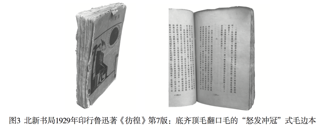 与西方前现代阅读经验的汲取相应,另一个值得注意的史实是,周氏兄弟引入的毛边本形制并非一成不变,其本土化过程中也带入了周氏兄弟等人来自本国传统的阅读感觉。“毛边党”唐弢先生曾就自己的藏书做过一番有趣的考据:“新潮社文艺丛书”的一系列出版物,将书顶纸张切光,不裁切书口与书根折叠的纸张,即保持毛边在书口与书根。到1920年代中期北新书局从新潮社彻底分离后,毛的一边渐渐移到书顶,反而将书根纸张切光,毛边在书口与书顶,对于这种书顶毛边,鲁迅曾比喻为人的头发17,所谓“底齐顶毛翻口毛”,成为北新毛边本的标准制式,并影响了中国文艺书的装帧18。