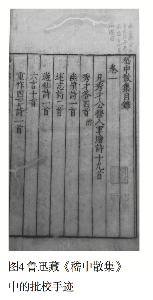 鲁迅对《嵇康集》辑校甚精,此为鲁迅所使用的底本之一,其校勘法即为在内页天头以朱笔批注。册页见《图4:鲁迅藏〈嵇中散集〉中的批校页》,图像转自北京鲁迅博物馆编、韦力撰《鲁迅藏书志(古籍之部)》上,中华书局2016年版,彩页第8页。