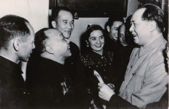 毛泽东主席(右一)与侯宝林(左三)等艺术家在一起