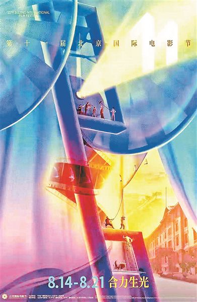 本届电影节海报主题命名为“合力生光”,设计主体沿用了上一届海报的核心元素——风车放映机。叶片转动,灯光亮起,眼前的大幕正在徐徐拉开。风车之上,一队电影工作者正在那里工作,导演、摄像、灯光、录音、场记、化妆……而拉开的大幕后浮现出的是长城、北大红楼和盘旋天上的北京雨燕。