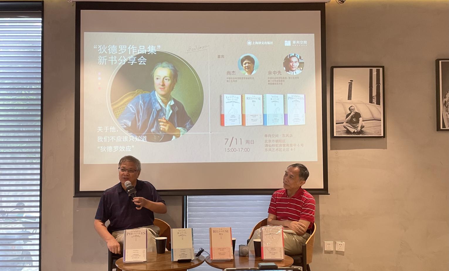 7月11日下午,上海译文出版社在北京单向空间东风店举办以“关于狄德罗,电竞竞猜不应该只知道狄德罗效应”为主题的新书分享会,中国社会科学院哲学所研究员尚杰和法语文学翻译家余中先共同讲述狄德罗在文学和思想等方面的贡献。分享会由上海译文出版社狄德罗作品集策划编辑李月敏主持。