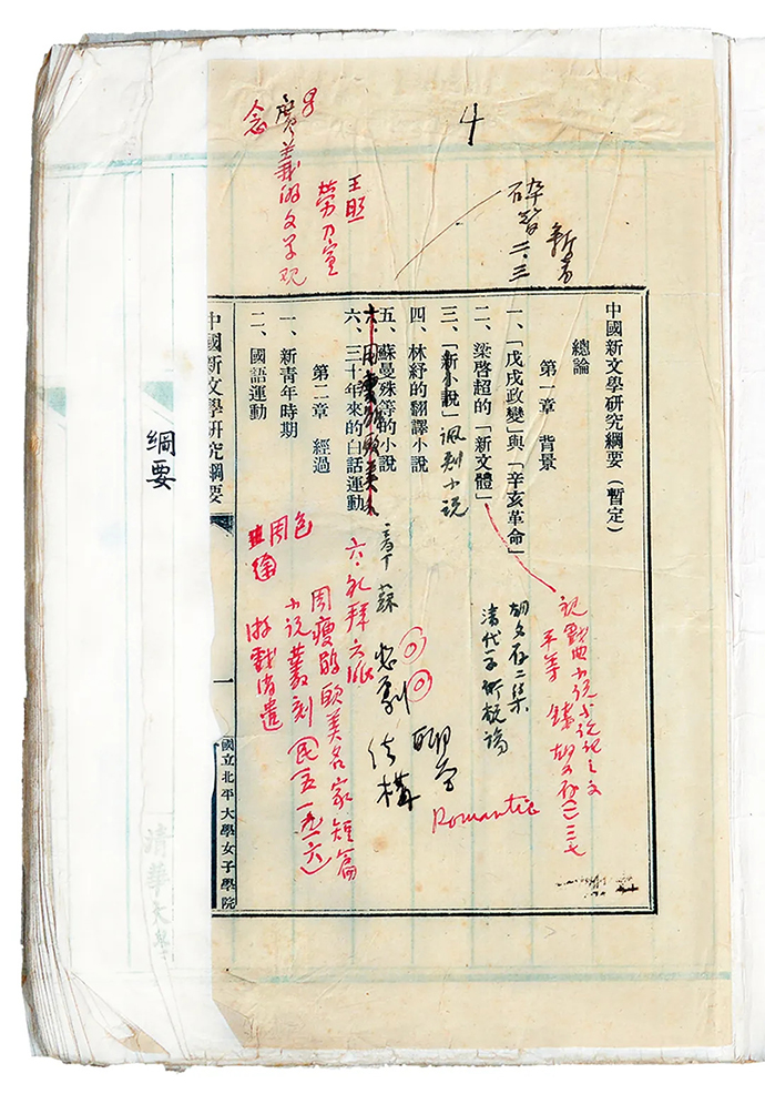该手稿封面有“十八年”字样,前面纲要中有几小时讲完字样,显然为1929年讲课所用,同时也是存世最完整本。铅印纲要目录竖式打印,打印框左边上有“中国新文学研究纲要”字样,左下为“国立北平大学女子学院”字样,打印纸粘贴在清华大学笺纸上。