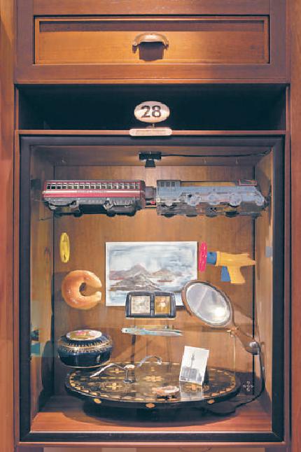 对应着小说的第28章“物件给予的安慰”。从图片可以看出展品包含的不同物件,如玩具火车,最靠后部的一幅水彩画,名《红轮船》,下方的手表,钟表等不同物件。