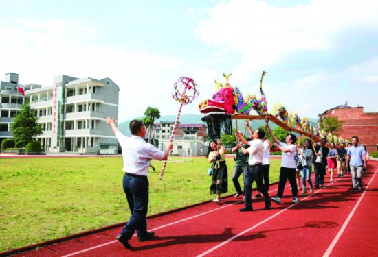 2017年5月,第七期“网络作家体验营”走进浙江省龙泉市。图为网络作家体验舞龙。