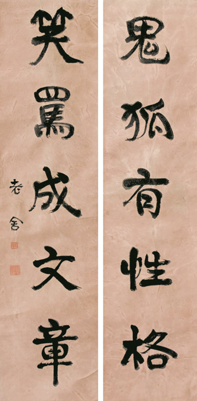 此为老舍对联,取自北碑,线条凝练厚实,但用笔却并非一路重按到底,而是起伏开张,略有《石门铭》之气象。
