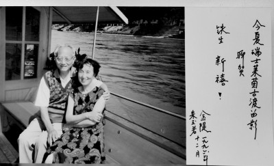 金先生是很有情趣的老先生,有一年当我打开书信,突然一张贺年卡跃入眼帘。这是金先生自己用照片制作的特殊的贺年卡,我一直珍藏着。贺卡左侧是一张彩照,瑞士莱茵河畔,金先生白衬衫外套着花格背心,夫人一袭大花的红黑相间连衣裙,老夫妻相亲相爱地坐在船上,笑得很惬意、幸福。右侧是空白,金先生的笔迹: