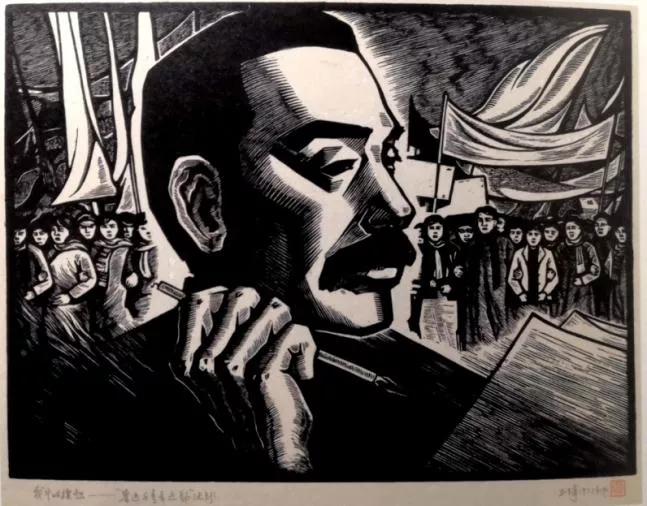 图6 战斗的旗帜——鲁迅与青年运动 王琦 1973年 木刻