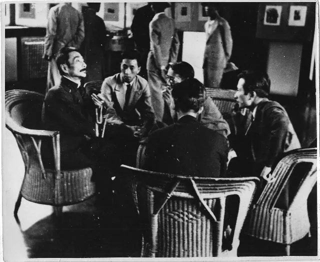 不仅如此,鲁迅图像中的场景也是为了更好地展现鲁迅的权威地位而设计。在鲁迅图像中,描绘历史事迹和特别场景的叙事性图像更能引发想象,也更有内涵空间。譬如黄永玉所作的《鲁迅和木刻青年》(图17),此画将场景设计为左右对立,执烟昂首正在讲话鲁迅居左,凝神静听或坐或站的青年们居右。按照常理,这种左小右大不对称的场景设计,重心自然在右,但这幅木刻中,画面中心却在左侧,即鲁迅仍然是画面核心。有两方面的因素确保了鲁迅的核心位置,一是青年们整齐划一投向鲁迅的目光,二是鲁迅和青年们服饰上的黑白异色,使鲁迅更为突出。实际上,黄永玉此作是有照片原型的,沙飞的这幅摄影(图18)当为其构思底本。黄作中的鲁迅形象简直完全脱胎于沙飞照片,所不同的是,黄作以艺术的手法重排了青年的空间位置,更加深刻、生动地展现了鲁迅的导师形象。