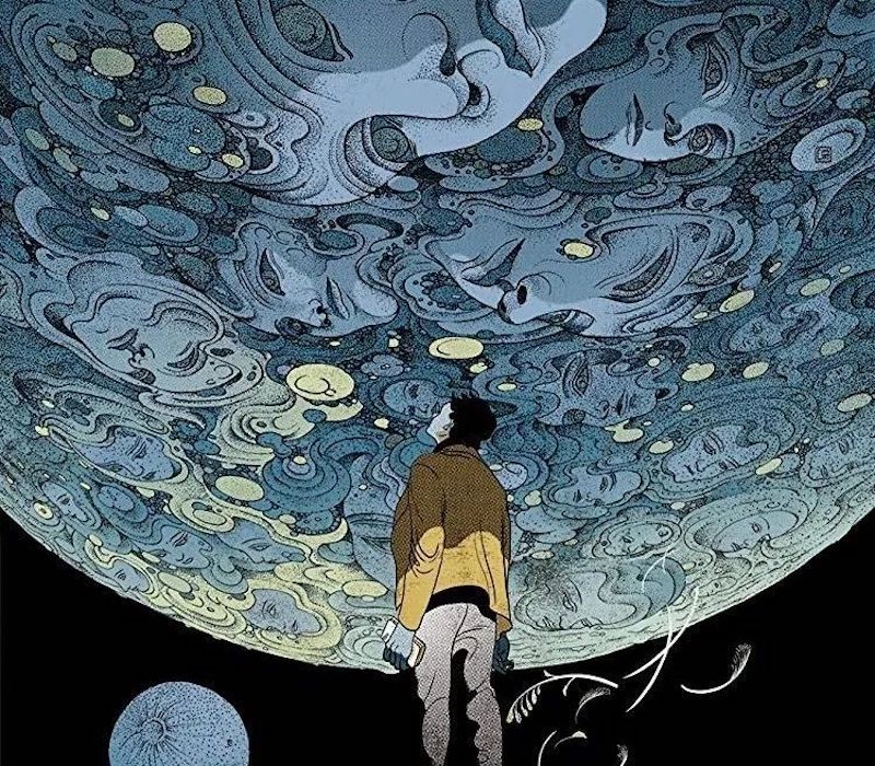 主人公来到索拉里斯星的探测站,见到了自己已逝妻子的幻象,似乎反倒是神秘的索拉里斯星海洋在探测来到此处的人类的内心世界(图像艺术家:Victo Ngai)