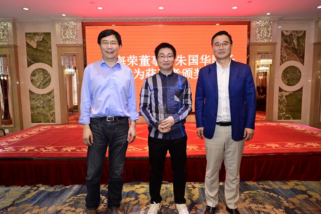 分众传媒执行董事嵇海荣,华东师范大学国际汉语文化学院院长朱国华为爱潜水的乌贼颁奖。