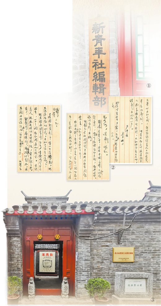 图①:北京《新青年》编辑部办公室;图②:1920年5月7日陈独秀致李大钊、胡适的信;图③:北京《新青年》编辑部旧址大门。朱悦华、张丁供图