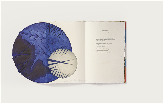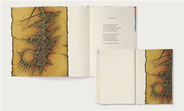 至于第三种类型,我愿意称之为“乐队类型”的艺术家手作书。这类创作通常由等量级的艺术家围绕一个共同的主题联合创作,比较强调参与者在艺术史地位、社会地位等层面上的对等。比如我收藏的一套由20世纪公认的意大利最著名的八位雕塑家联合创作的作品《友谊之光》,是为了庆祝意大利国宝级艺术家阿纳尔多?波莫多罗90岁生辰所作。