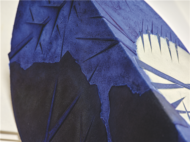 形容《玫瑰与天空之喜悦》令人叹为观止毫不夸张。书中奇异华美的“纸上雕塑”呈现出一种匪夷所思的金石质感。如果有机会漫步意大利梵蒂冈,就应该对梵蒂冈博物馆庭院中庭的一件黄铜质地雕塑过目难忘。这件被命名为《球中球》的球形雕塑直径超过4米,观者透过球体的裂缝可以看到犬牙交错的“利齿”,既像交错的齿轮,又让人联想到累累的伤痕。这样一座富有现代感的作品伫立于古老的梵蒂冈中庭非但毫不违和,反而气场强大,恰如其分地烘托和呼应了这里宗教与艺术圣地的氛围。艺术家手作书《玫瑰与天空之喜悦》中锯齿的形状和金石般的肌理与这一雕塑的特点如出一辙。它们到底是如何产生的呢?原来,意大利地中海中部沿岸,居住着一些从事雕塑及首饰创作的家庭,因地制宜地利用墨鱼体内一种圆弧状的骨头制作母版,是这些手工家族中世代流传的铸造秘密。雕塑上那些既具有点状肌理,又具有金石质感的样子,便来自那些致密而坚硬,“即使在火中也无法轻易烧化”的骨骼。