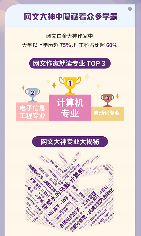 不少“学霸”隐藏在网文作家中,他们结合自己的专业背景和职业经历,创作了系列“硬核”故事。《画像》显示,阅文白金、大神作家中,大学以上学历超75%,理工科占比达60%。以文字为生的网文作家,计算机专业、电子信息工程专业、自动化专业是他们就读专业TOP3。阅文旗下作家,爱潜水的乌贼、囧囧有妖、血红和叶非夜均是计算机专业出身,公子衍和言归正传皆为电子信息工程专业。