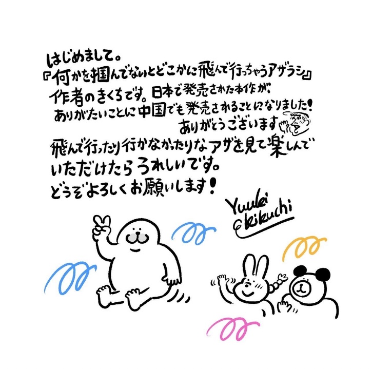 在《不抓住什么就会飞走的海豹君》中文简体版上市之际,作者菊池也发来了给中国读者的来信: