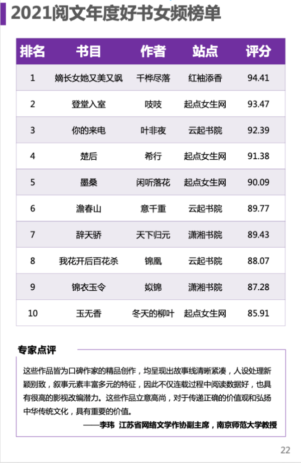 “上榜女频作品均呈现出故事线清晰紧凑,人设处理新颖别致,叙事元素丰富多元的特征,因此不仅连载过程中阅读数据好,也具有很高的影视改编潜力。这些作品立意高尚,对于传递正确的价值观和弘扬中华传统文化,具有重要的价值。” 江苏省网络文学作协副主席、南京师范大学教授李玮评价。