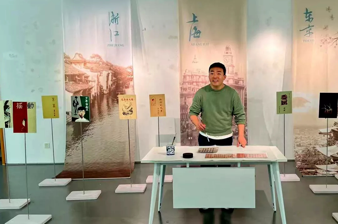 立体书装置自成打卡留念区,看完手迹展,站在茅公书桌前,自己也挥笔在字帖上留下墨迹。