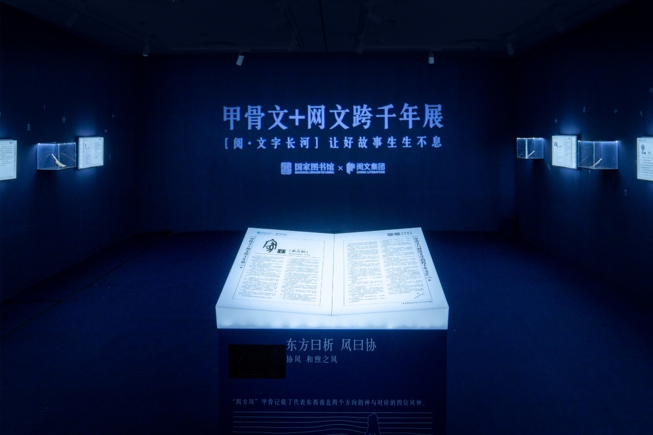 正在国图?津湾文创空间展出的“甲骨文+网文跨千年展”中,不同时代的文字汇聚交融,形成了别出心裁的“阅?文字长河”艺术装置,甲骨文、金文、小篆、隶书、楷书、简化字,文字流变的脉络在其间清晰可见。观众观展时,不仅可以近距离感受甲骨文的字形之美,还可以扫码阅读网文作家为它创作的微故事。国家图书馆副馆长张军期待,通过活动进一步扩大古文字文化的传播,推动中华优秀传统文化创造性转化、创新性发展,展现中华文化的影响力、凝聚力、感召力。