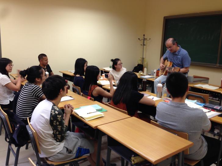 2017年5月9日,韩裴在北京外国语大学保加利亚语2014级保语专业课堂上即兴弹唱