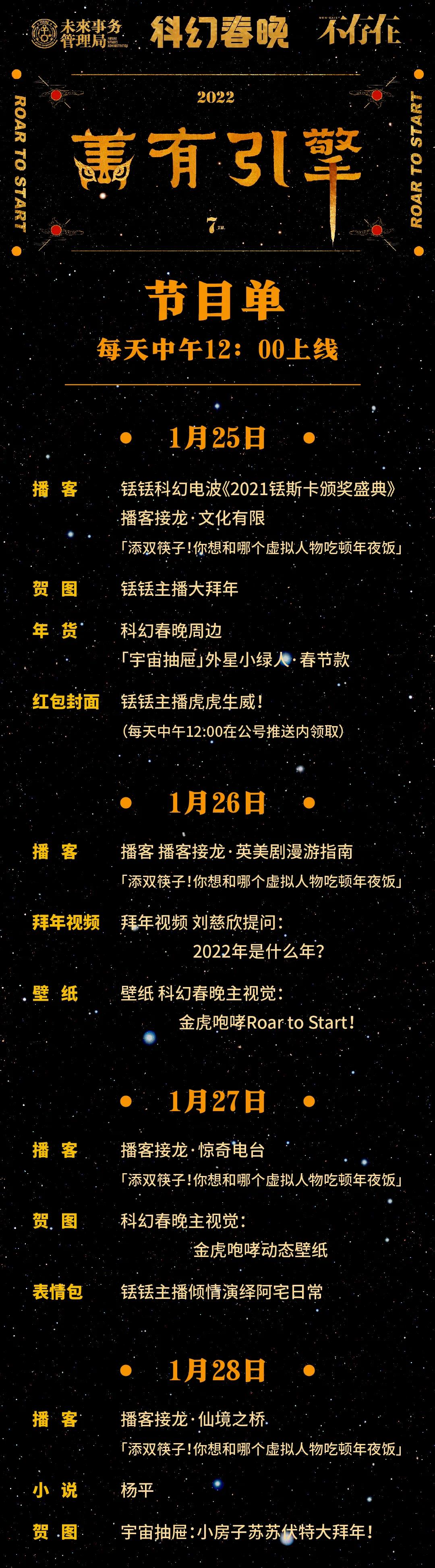 今年,科幻春晚的所有创作者将同台竞技,来自5个国家的11位作者,来自6家播客的十几位主播,还有画家、艺术家、设计师们,将在「万有引擎」的主题下,为你呈现阅读、声音、视觉的盛宴。