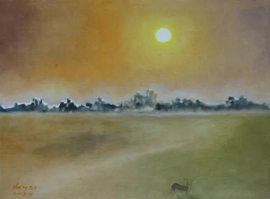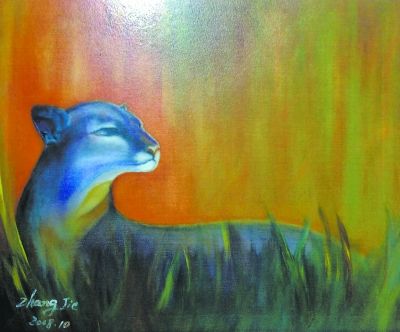 一帧画于2008年的豹子,我愿意把它叫做雌性的雪豹。画中雪豹正在回眸,被绸缎般亮丽而又锋利的阔叶草簇拥。那柔韧、结实的颈部与修长、矫健身躯所构成的优美曲线,衬着层次丰富的橙黄色眩目背景,使整个画面充满弹性的紧张感。逆光中的雪豹,当它的脖颈被一团侧光照耀时,作者有意凸显的这个局部就焕发出揉杂着淡紫罗兰色的高贵。接着你会被雪豹的眼神吸引:孤傲、警觉,又充溢着湿润的忧郁,一种不打扰同类亦不打扰人类的自尊。我被这豹子的眼神所打动,强烈的主观刻画刹那间连接了动物和人心的沟通。对照那幅“写意”的侧脸女人,与这雪豹竟有一种灵魂与气质上莫名的神似。在张洁的画作里,与生俱来一种人与动物、动物与风景之间的平等和信任。在她心中的风景里,也说不定动物比人更像人。我不能说这幅作品在艺术上达到何样高度,但我可以说,张洁已显示出她作为一个艺术家所必备的锐利眼光、表现能力和叛逆之心。她的画面常大胆运用橙黄、橙红、桔黄等颜色,亦有大面积绿色入画,更证实了她对色彩的自觉训练与胸有成竹的把控。黄和绿是油画颜料里最容易被“画脏”的颜色,张洁呈现给观众的是热烈的明澄和清透的丰富。