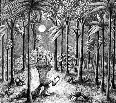 与大江的主张不谋而合,森达克也认为成年人以为只让孩子阅读光明与美好的故事是在保护孩子们,其实他们只是在保护自己。关于这个世界的光明与黑暗,孩子们知道的远比成年人所以为的要多。所以,森达克笔下的童年多是阴暗的,其中的主角也会面对可怕和危险的情况,但最后他们总是会安然无恙地回到家中。孩子们在阅读他的绘本时仿佛是在经历旅行,翻到最后一页时,最初的恐惧、紧张、胆怯和好奇都会得到释放,内心产生的共鸣让他们最终获得了平静与成长。