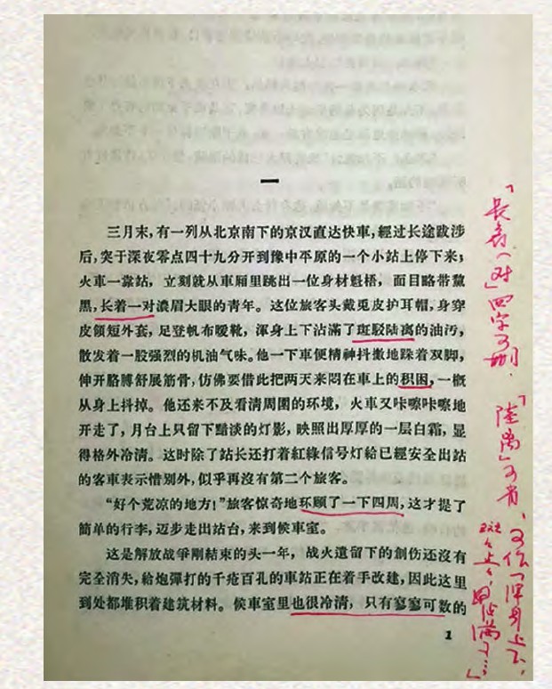 20世纪60年代初,关于茅盾先生的评论创作形成这样一种流程:阅读留下眉批、批注、札记—整理加工眉批为手稿—修改定稿为印刷稿—公开发表或宣读[4]。在阅读过程中,茅盾先生秉承了这一时期的阅读眉批批注习惯,一边读一边点评、批注[5],书中留下了十分详细的批注,有关于细节的画线、批注,还有关于章节的整体评论。