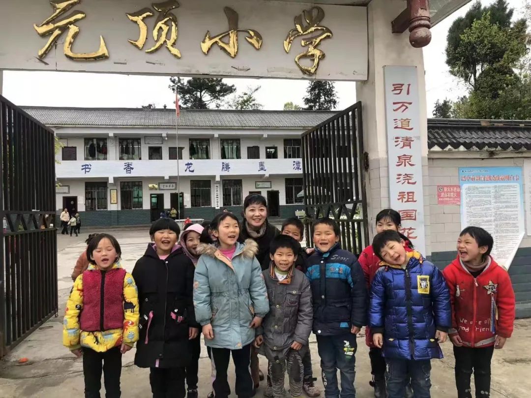 殷健灵和孩子们在元顶小学校门前合影