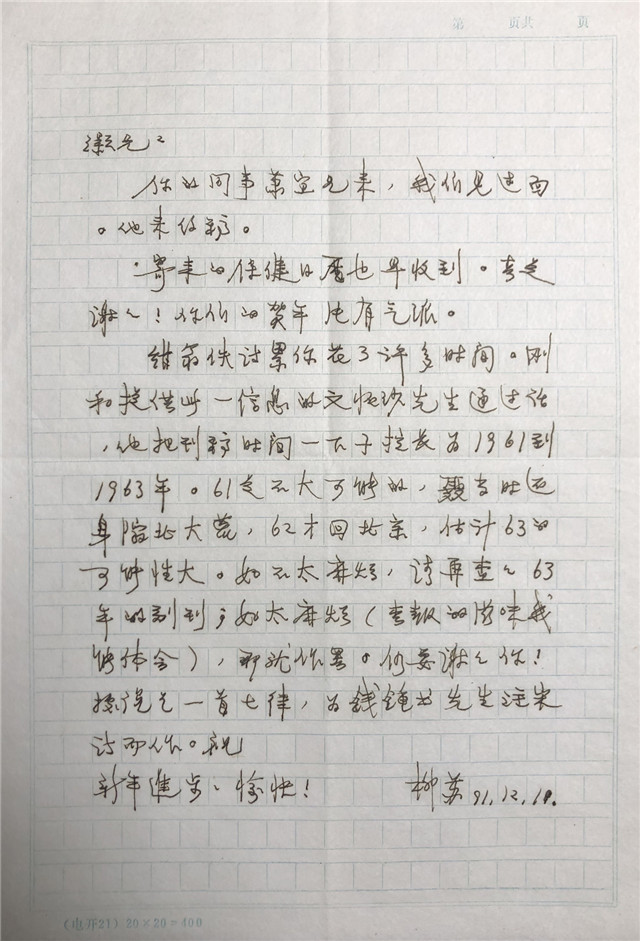 绀翁佚诗累你花了许多时间。刚和提供此一信息的文怀沙先生通过话,他把刊稿时间一下子拉长为1961到1963年。61是不大可能的,聂当时还身陷北大荒,62才回北京,估计63的可能性大。如不太麻烦,请再查查63年的副刊;如太麻烦(查报的滋味我能体会),那就作罢。仍要谢谢你!据说是一首七律,为钱锺书先生注宋诗而作。