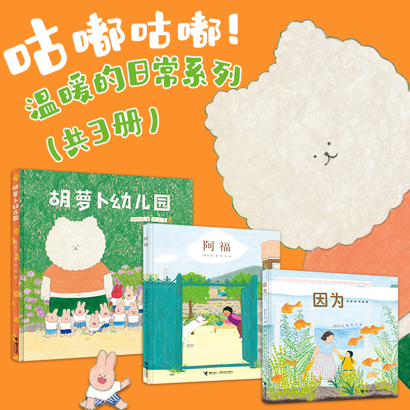 在《胡萝卜幼儿园》中,从我的老师特别凶,到我的老师特别帅,大熊老师到底对刚刚入园的小兔子施了什么魔法呢?在《因为……》中,如果你家爱面子的小朋友在幼儿园尿裤子了,你会怎样和他一起面对这件糗事呢?还有在《阿福》中,这只叫阿福的狗狗是怎样的抚慰那些孤独的心呢?