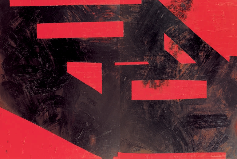 1999年至2003年之间,《直角》《椅子和椅子》《某年某月某日》《自己和自己的影子》《行》《四合》《红》等一批作品接连问世。人们在这批作品中已经看不到王怀庆曾经过硬的速写功底、塑造人物的肖像能力以及唯美而简淡的诗境,只留下更加冷峻理性的图式与笔触。这些“物形”被解构的画面让观众直接越过客体,进入交错线条节奏与结构的审美,引发对人与天、人与地、人与人、人与己四合关系的深层思考。王怀庆试图给这个纷乱世界以秩序的力量。
