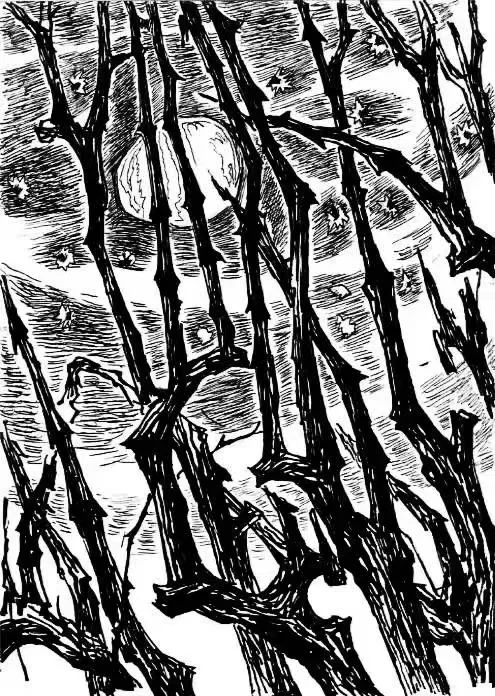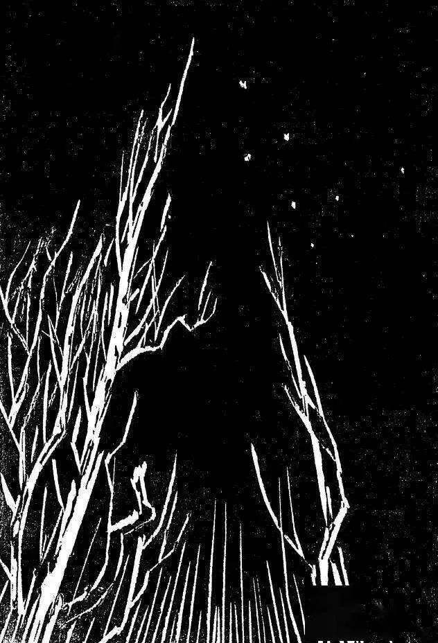 与“低亚着”的“几枝”相比,“最直最长的几枝”却呈现出另外的形态,且与“天空”构成了尖锐的对峙:“默默地铁似的直刺着奇怪而高的天空,使天空闪闪地鬼?眼;直刺着天空中圆满的月亮,使月亮窘得发白。”