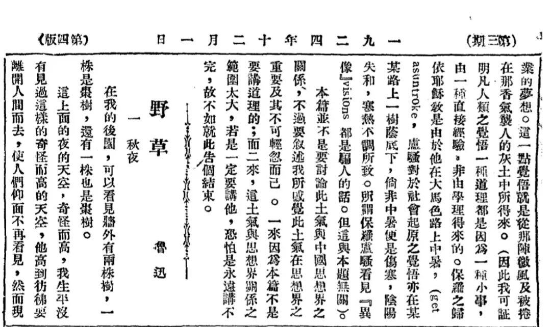 《野草·秋夜》初刊本,《语丝》第三期第四版,1924年12月1日