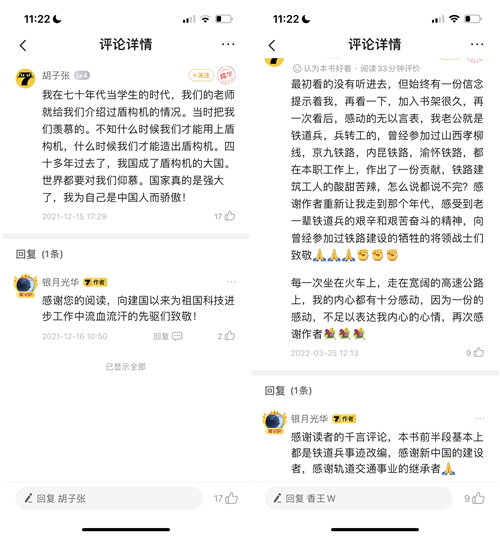 虞婧:我看见七猫小说阅读APP上有很多读者评论,其中好多读者就是这个行业的从业人员或者家属,小说走进了工业人的心灵世界,有很多条您都回复了。看到他们的评论,您有什么体会,有没有什么印象深刻的评论,或者比较尖锐的批评意见?
