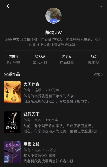 打开起点中文网的体育小说频道,在《大国体育》的单章里,你可能会读到这样的“请假条”。在作者静物的介绍栏里写着“作者身体抱恙,仍坚持每天更新”。