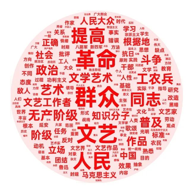 上图是以中国文明网发布的毛泽东同志《在延安文艺座谈会上的讲话》为文本内容,通过词频分析生成的文字云图。