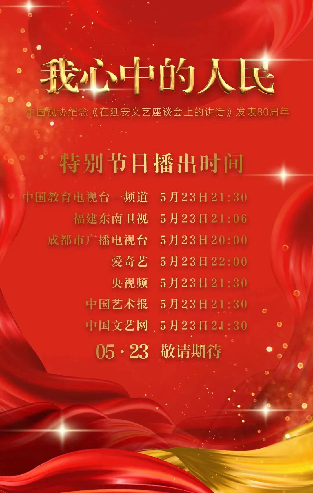 为了纪念毛泽东同志《在延安文艺座谈会上的讲话》发表80周年,高扬“文艺为人民服务”的主题思想,由中国电视艺术家协会主办,中国视协演员工作委员会、成都市广播电视台具体承制的“我心中的人民——纪念《在延安文艺座谈会上的讲话》发表80周年”特别节目将于2022年5月23日正式上线播出。