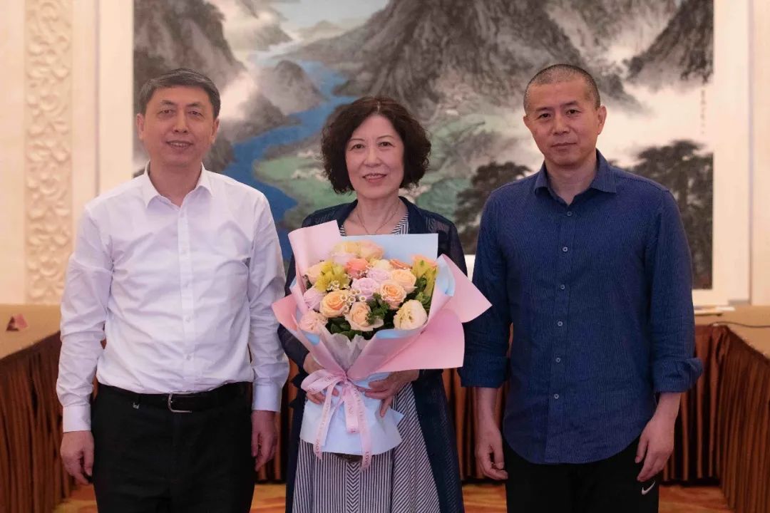 向黄蓓佳献花 (左起:汪兴国、黄蓓佳、毕飞宇)