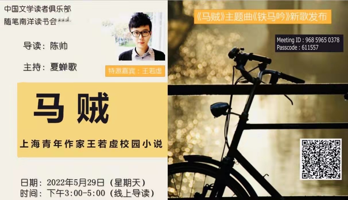 5月29日,新加坡中国文学读者俱乐部组织导读中国青年作家王若虚的校园小说《马贼》,由新加坡作家陈帅主讲。活动创新了形式,特别邀请新加坡音乐人以原创主题歌曲的方式参加。活动通过Zoom平台在线上举行,并在新加坡国家图书馆的脸书页面进行了直播。作家王若虚在线与读者进行了深度交流。
