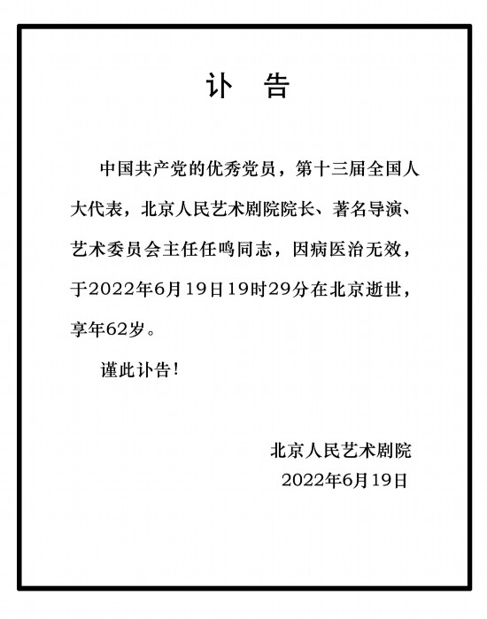 北京人民艺术剧院发布讣告:中国共产党的优秀党员,第十三届全国人大代表,北京人民艺术剧院院长、著名导演、艺术委员会主任任鸣同志,因病医治无效,于2022年6月19日19时29分在北京逝世,享年62岁。