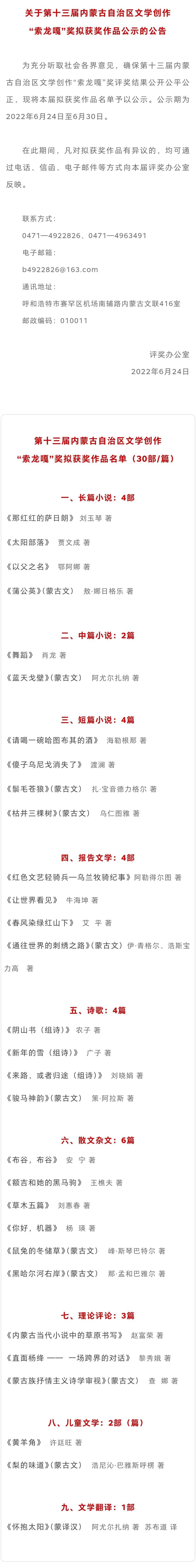 关于第十三届内蒙古自治区文学创作“索龙嘎”奖拟获奖作品公示的公告