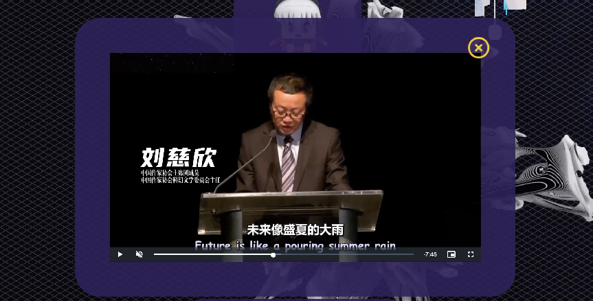 所有参观者连接虚拟世界,进入“元宇宙”,首先落地的地方就是入口论坛。星空背景的平台上有一朵在太空中崩裂的水花,参观者可以在这里观看刘慈欣获得“克拉克想象力服务社会奖”时的完整演讲。韩松和陈楸帆的演讲视频也通过类似的方式进行展示。
