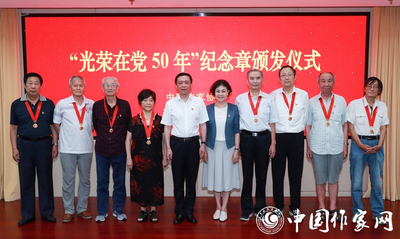 纪念章颁发仪式上,铁凝、张宏森向到会的李冰、王西营、张文良、岳巍、侯秀芬等老党员颁发纪念章,并献上鲜花,向荣获纪念章的所有老党员表示崇高的敬意和衷心的感谢。范咏戈、周所同、朱先树代表荣获纪念章的老党员发言,表达了坚定不移听党话、矢志不渝跟党走的决心,并表示要和同志们一起,不忘初心、牢记使命,始终与以习近平同志为核心的党中央保持高度一致,不负人民不负党,为党的事业贡献力量。随后,全体与会党员在张宏森同志的带领下,面向党旗,重温入党誓词。