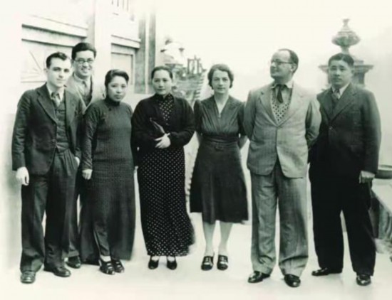 宋庆龄为抗日募款宣传而组织“保卫中国同盟”。从左到右分别是爱泼斯坦、香港《华商报》创办人邓文钊、廖仲恺之女廖梦醒、宋庆龄、司徒永觉的夫人希尔达·塞尔温-克拉克(Hilda Selwyn-Clarke)、电竞竞猜的主人公佛朗士和廖仲恺之子廖承志,摄于1938年。香港大学档案馆藏。