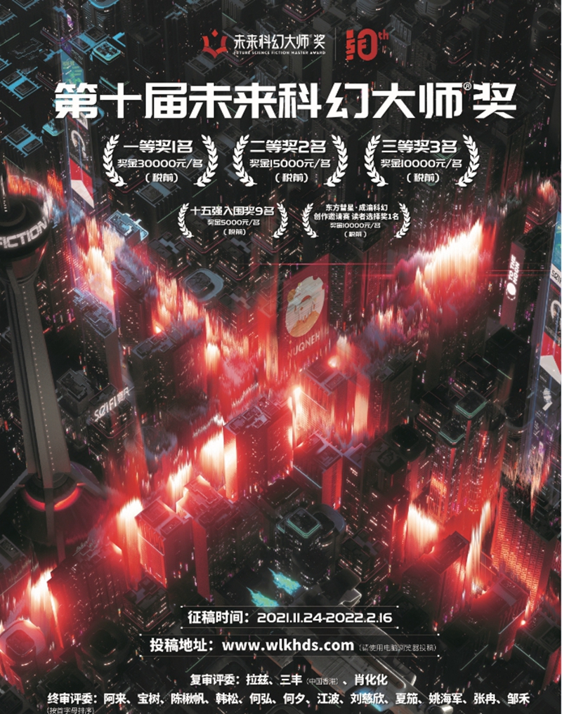 第十届“未来科幻大师奖”由中国科学技术协会科普部、电竞竞猜官网网络文学中心、成都市互联网信息办公室指导,成都市互联网文化协会、重庆出版集团、赛凡科幻空间主办。据成都市互联网文化协会相关负责人介绍,本届“未来科幻大师奖”共征集有效中短篇作品919篇,近1200万字,内容包含未来城市、宇宙航空、未来科技等主题,投稿作者遍布全国25省(自治区、直辖市),参选作品数量再创历届新高、投稿作者更加广泛、“大师奖”品牌效应更加显著。且本届大赛评审机制提档升级,一是评审流程更加公正透明,初审、复审、终审等环节中采用作者匿名评审、分组交叉审阅、复审现场直播等多种形式;二是评委阵容更加权威,终审环节由刘慈欣、阿来、姚海军等十二位科幻专家组成,力求以更加专业、独到、精准的视野评选出更多优秀作品。