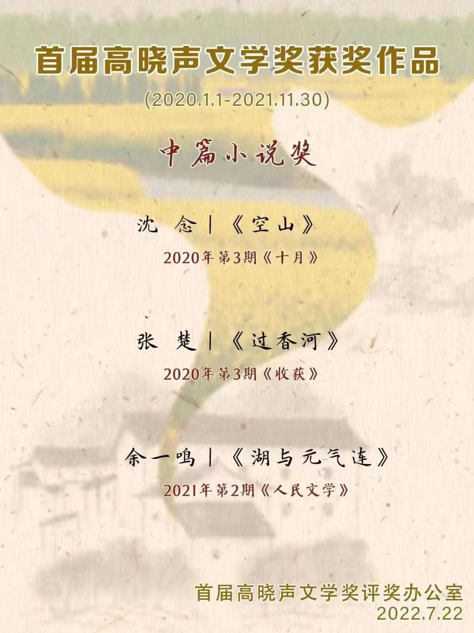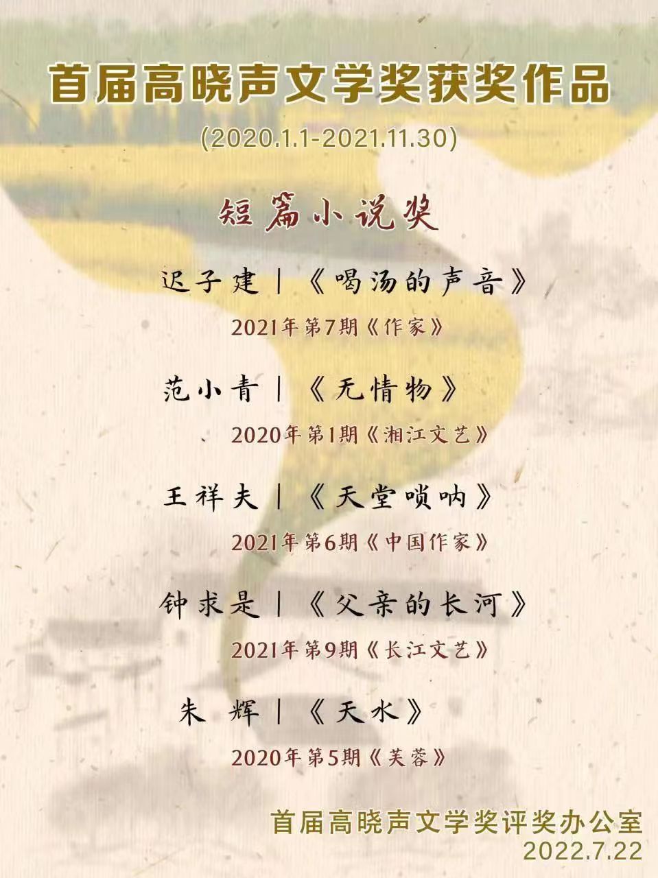 7月22日,首届高晓声文学奖在江苏省常州市揭晓,《有生》《空山》《喝汤的声音》等10部(篇)作品分获长篇小说奖、中篇小说奖、短篇小说奖。江苏省作家协会党组成员、书记处书记、副主席丁捷,常州市委宣传部副部长、市新闻出版局(版权局)局长谢春林,常州市文联党组书记、主席舒文,南京大学教授王彬彬,江苏凤凰文艺出版社原社长黄小初等出席首届高晓声文学奖新闻发布会。发布会由常州市委宣传部四级调研员王志新主持。