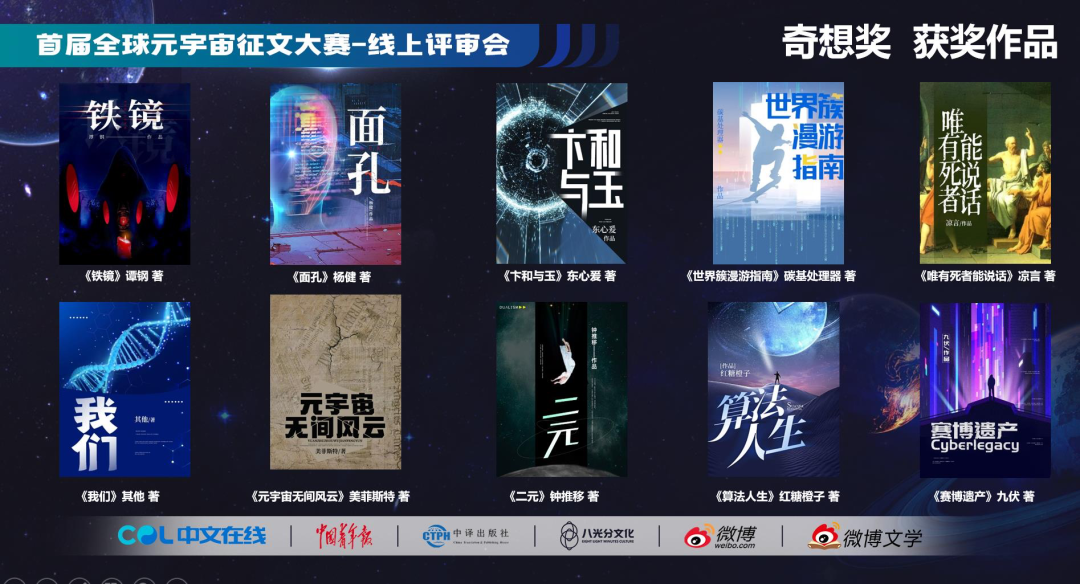 7月31日,中文在线的全球元宇宙大赛奇想奖(科幻小说类)揭晓,十部获奖作品从上万部参赛作品中胜出,每部获奖金10万元,共100万元,中国科幻的第一个百万大奖诞生(四届京东文学奖科幻奖1名,纯奖金20万元)。我隐隐约约地感觉到,“《三体》后时代”的中国科幻界,正在元宇宙题材上杀出一条血路,离突破性的作品出现的时间不远了 。