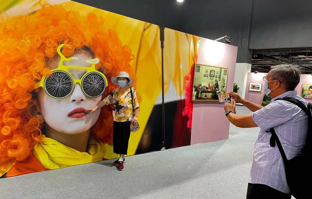 观众在“无主题艺术类”展墙前与作品合影。张双双 摄