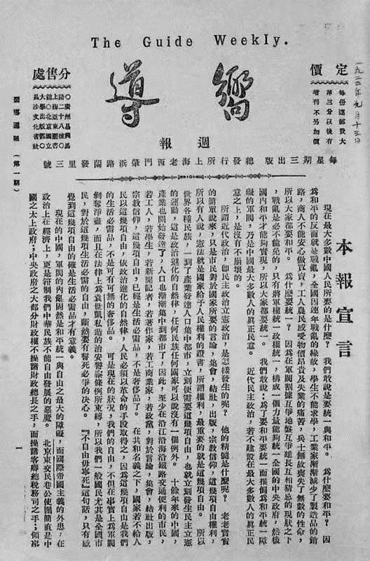 1922年9月13日,《向导》周报在上海老西门肇浜路兰发里三号(今上海市黄浦区复兴东路1047弄3号)创刊,由蔡和森担任主编。《向导》周报以“统一、和平、自由、独立”为办报宗旨,有8个版面,除报头外其余内容采用的是当时报刊通用的竖排版格式,设有“中国一周”“世界一周”“时事评论”“读者之声”等栏目。《向导》周报以宣传中国共产党的路线、方针、政策和评论国内外时政为主,及时报道和评论时事,以指导现实斗争,系统地阐述中国共产党反帝反封建的民主革命纲领,阐明建立以国共合作为中心的革命统一战线的重要性。